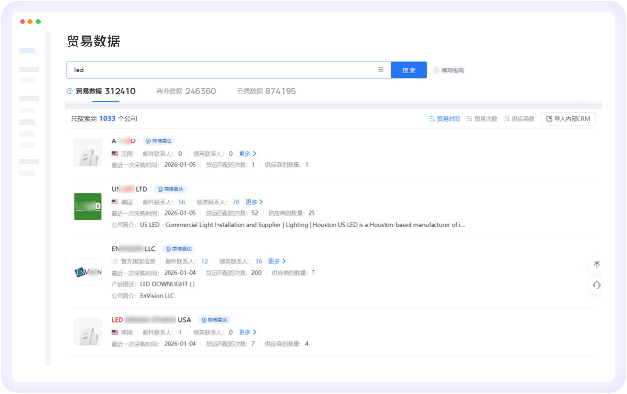 依托AI全新打造的智能、精准的高价值客户开发利器,给予具备全球视野的市场洞察、潜客获取、竞企监测、客户分析等一站式服务