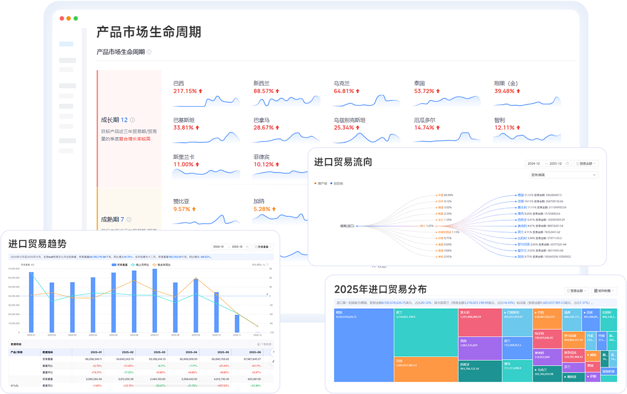 基于100亿+真实贸易数据,结合精准搜索和多元化报告功能,精准分析全球市场变化、定位高价值市场,找到新的业绩增长点。