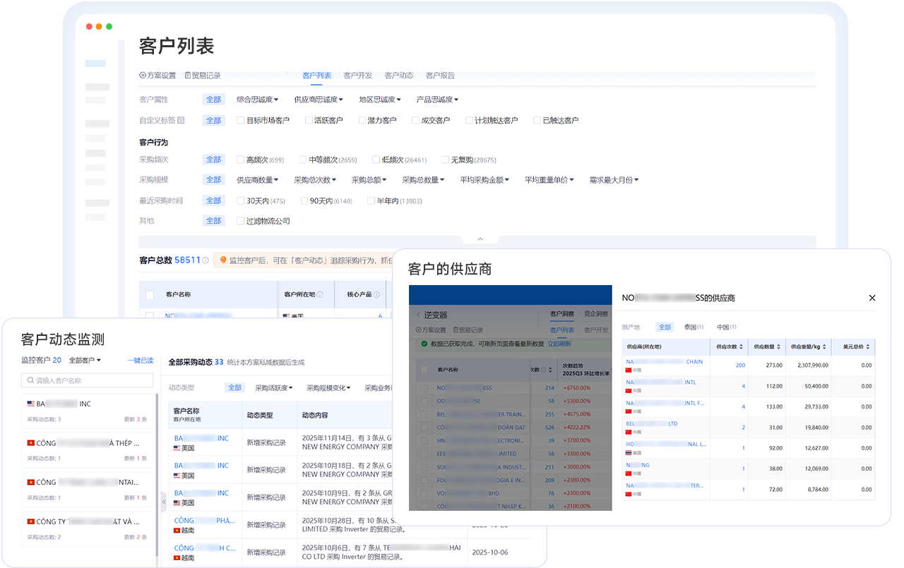 依托AI全新打造的智能、精准的高价值客户开发利器,给予具备全球视野的市场洞察、潜客获取、竞企监测、客户分析等一站式服务